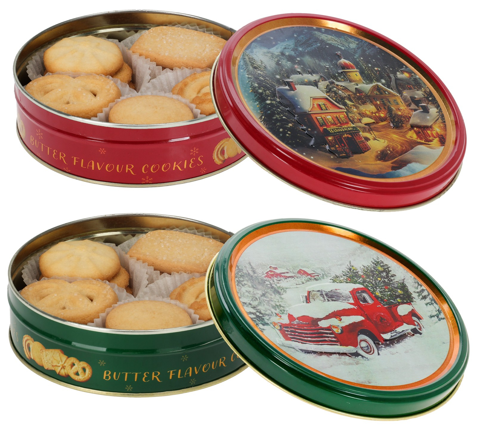 Cutia metalică festivă de Crăciun ascunde o selecție de biscuiți fragezi, cu aromă fină de unt, perfecți pentru a fi savurați alături de o ceașcă de ceai sau cafea în zilele reci de iarnă.
